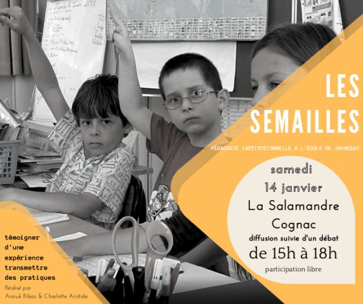 Samedi 3 décembre 2022 – dans le cadre des Rencontres LIFE, Soigner le milieu – Actualité et fécondité de la pédagogie institutionnelle – à l’université UniMail de Genève (Suisse) : version de 27 minutes diffusée en introduction d’une table ronde des praticiens de la pédagogie institutionnelle, grâce au soutien du laboratoire EMA (Université de Cergy-Pontoise).